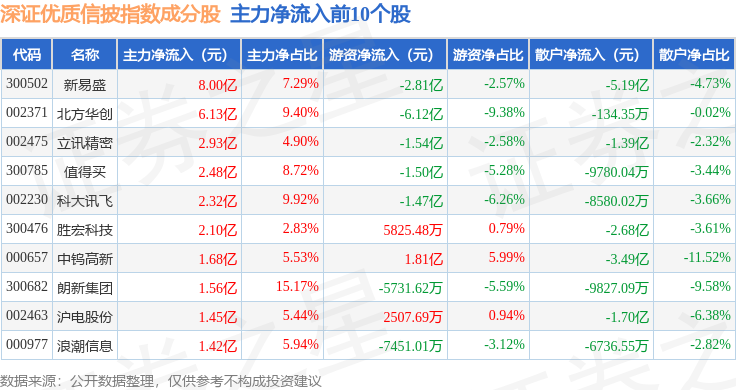 资金流向方面,深证优质信披(970065)指数成份股当日主力资金净流出合计207.06亿元,游资资金净流入合计42.35亿元,散户资金净流入合计164.72亿元。成份股资金流向详情见下表: