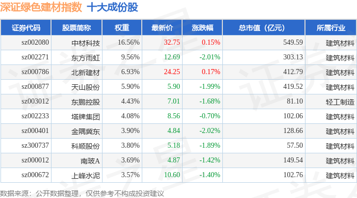 证券之星消息,11月18日,深证绿色建材(970077)指数报收于1351.1点,跌1.46%,成交67.1亿元,换手率2.13%。当日该指数成份股中,上涨的有5家,四川双马以1.69%的涨幅领涨,下跌的有24家,沧州明珠以8.6%的跌幅领跌。