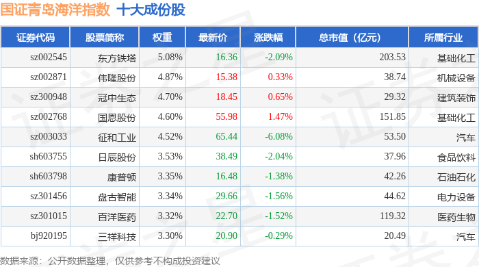 国证青岛海洋(980532)指数十大成份股详情如下: