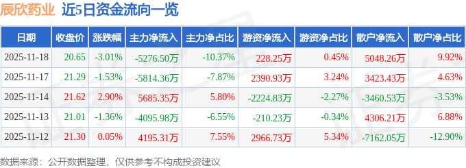 证券之星消息,截至2025年11月18日收盘,辰欣药业(603367)报收于20.65元,下跌3.01%,换手率5.42%,成交量24.52万手,成交额5.09亿元。