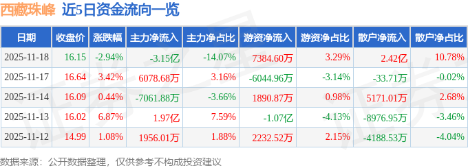 证券之星消息,截至2025年11月18日收盘,西藏珠峰(600338)报收于16.15元,下跌2.94%,换手率14.76%,成交量134.92万手,成交额22.42亿元。