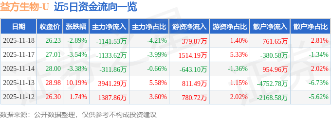 证券之星消息,截至2025年11月18日收盘,益方生物(688382)报收于26.23元,下跌2.89%,换手率2.44%,成交量10.17万手,成交额2.71亿元。