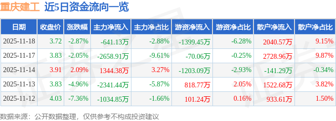 证券之星消息,截至2025年11月18日收盘,重庆建工(600939)报收于3.72元,下跌2.87%,换手率3.15%,成交量59.83万手,成交额2.23亿元。