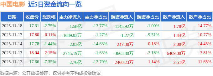 证券之星消息,截至2025年11月18日收盘,中国电影(600977)报收于17.31元,下跌2.75%,换手率3.53%,成交量65.92万手,成交额11.48亿元。