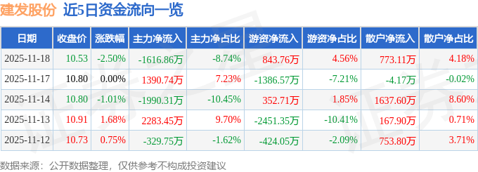证券之星消息,截至2025年11月18日收盘,建发股份(600153)报收于10.53元,下跌2.5%,换手率0.6%,成交量17.44万手,成交额1.85亿元。