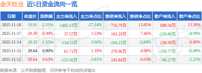 证券之星消息,截至2025年11月18日收盘,金天钛业(688750)报收于19.91元,下跌2.31%,换手率3.1%,成交量2.58万手,成交额5177.2万元。