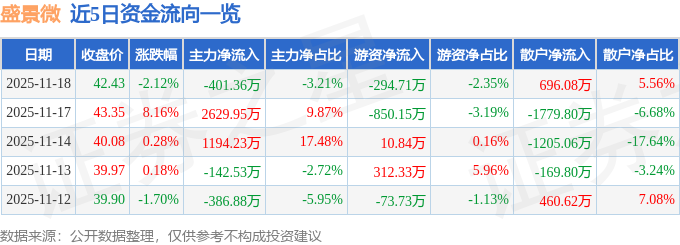 证券之星消息,截至2025年11月18日收盘,盛景微(603375)报收于42.43元,下跌2.12%,换手率4.61%,成交量2.94万手,成交额1.25亿元。