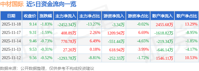 11月18日的资金流向数据方面,主力资金净流出2452.34万元,占总成交额13.27%,游资资金净流出3.34万元,占总成交额0.02%,散户资金净流入2455.68万元,占总成交额13.29%。