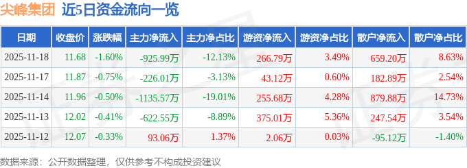 证券之星消息,截至2025年11月18日收盘,尖峰集团(600668)报收于11.68元,下跌1.6%,换手率1.58%,成交量6.51万手,成交额7634.17万元。
