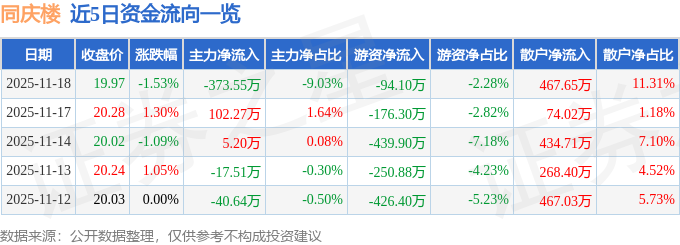 证券之星消息,截至2025年11月18日收盘,同庆楼(605108)报收于19.97元,下跌1.53%,换手率0.79%,成交量2.07万手,成交额4134.98万元。