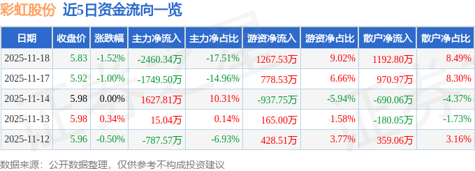 证券之星消息,截至2025年11月18日收盘,彩虹股份(600707)报收于5.83元,下跌1.52%,换手率0.67%,成交量24.0万手,成交额1.4亿元。