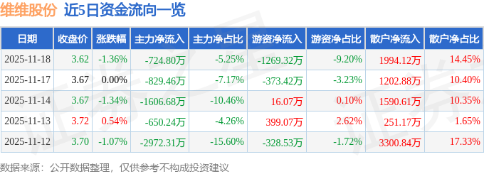 证券之星消息,截至2025年11月18日收盘,维维股份(600300)报收于3.62元,下跌1.36%,换手率2.36%,成交量38.08万手,成交额1.38亿元。