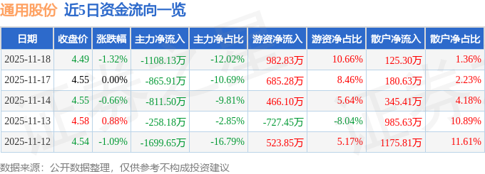 证券之星消息,截至2025年11月18日收盘,通用股份(601500)报收于4.49元,下跌1.32%,换手率1.3%,成交量20.51万手,成交额9216.59万元。