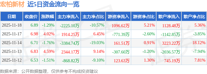 证券之星消息,截至2025年11月18日收盘,宏柏新材(605366)报收于6.89元,下跌1.29%,换手率4.69%,成交量30.52万手,成交额2.1亿元。