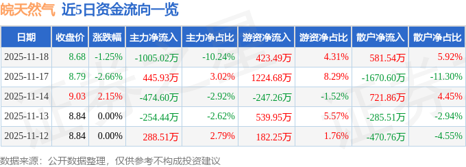 证券之星消息,截至2025年11月18日收盘,皖天然气(603689)报收于8.68元,下跌1.25%,换手率2.18%,成交量11.31万手,成交额9817.08万元。