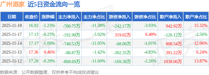 11月18日的资金流向数据方面,主力资金净流出700.75万元,占总成交额11.38%,游资资金净流出242.17万元,占总成交额3.93%,散户资金净流入942.92万元,占总成交额15.32%。