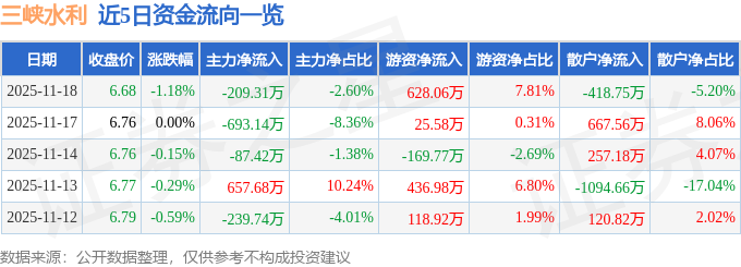 证券之星消息,截至2025年11月18日收盘,三峡水利(600116)报收于6.68元,下跌1.18%,换手率0.63%,成交量12.0万手,成交额8045.66万元。