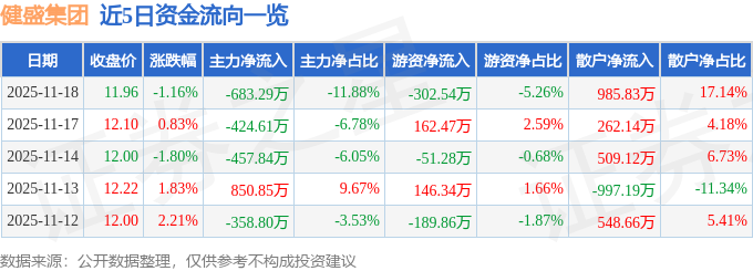 证券之星消息,截至2025年11月18日收盘,健盛集团(603558)报收于11.96元,下跌1.16%,换手率1.4%,成交量4.8万手,成交额5751.16万元。