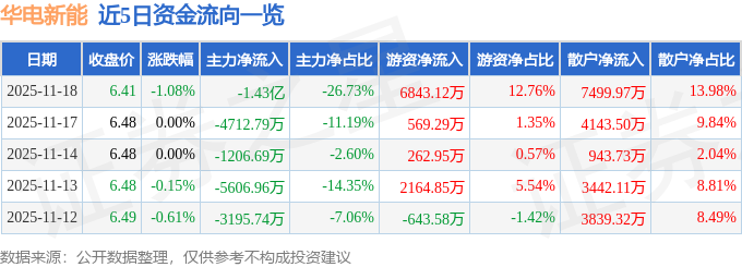 证券之星消息,截至2025年11月18日收盘,华电新能(600930)报收于6.41元,下跌1.08%,换手率3.33%,成交量83.33万手,成交额5.36亿元。