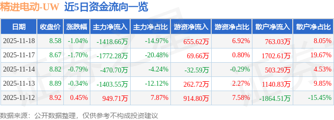 证券之星消息,截至2025年11月18日收盘,精进电动(688280)报收于8.58元,下跌1.04%,换手率2.1%,成交量10.95万手,成交额9476.58万元。