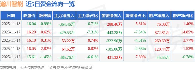 证券之星消息,截至2025年11月18日收盘,瀚川智能(688022)报收于16.04元,下跌0.99%,换手率1.93%,成交量3.39万手,成交额5432.39万元。