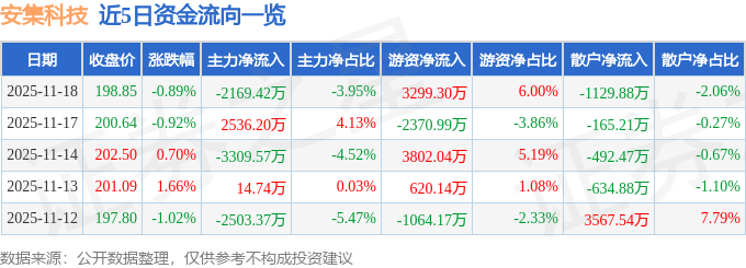 证券之星消息,截至2025年11月18日收盘,安集科技(688019)报收于198.85元,下跌0.89%,换手率1.63%,成交量2.75万手,成交额5.5亿元。