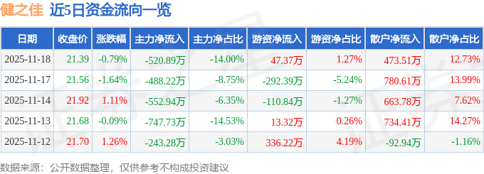 证券之星消息,截至2025年11月18日收盘,健之佳(605266)报收于21.39元,下跌0.79%,换手率1.13%,成交量1.74万手,成交额3720.94万元。