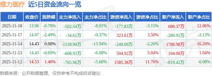 证券之星消息,截至2025年11月18日收盘,维力医疗(603309)报收于13.96元,下跌0.78%,换手率1.39%,成交量4.04万手,成交额5639.29万元。