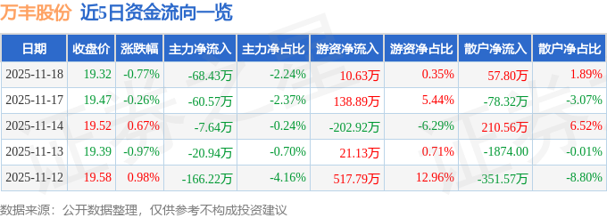 证券之星消息,截至2025年11月18日收盘,万丰股份(603172)报收于19.32元,下跌0.77%,换手率3.16%,成交量1.58万手,成交额3059.82万元。
