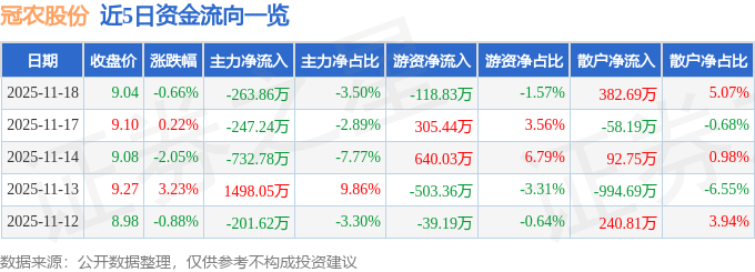 证券之星消息,截至2025年11月18日收盘,冠农股份(600251)报收于9.04元,下跌0.66%,换手率1.07%,成交量8.35万手,成交额7547.56万元。