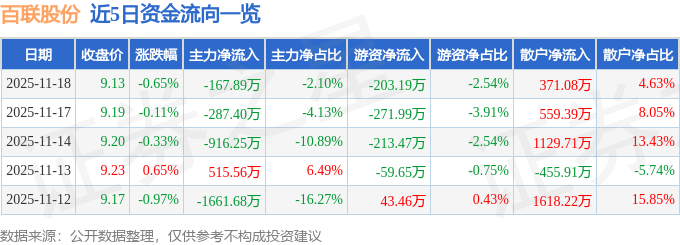 证券之星消息,截至2025年11月18日收盘,百联股份(600827)报收于9.13元,下跌0.65%,换手率0.55%,成交量8.79万手,成交额8007.06万元。