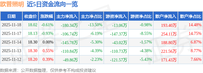 证券之星消息,截至2025年11月18日收盘,欧普照明(603515)报收于18.02元,下跌0.61%,换手率0.1%,成交量7393.0手,成交额1335.5万元。
