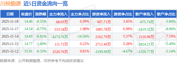 证券之星消息,截至2025年11月18日收盘,川投能源(600674)报收于14.46元,下跌0.55%,换手率0.25%,成交量12.13万手,成交额1.76亿元。