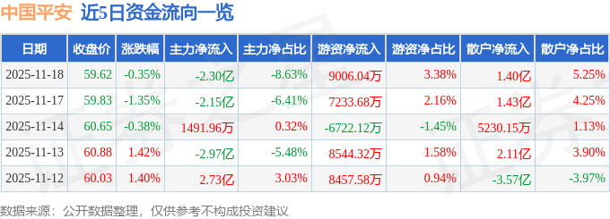证券之星消息,截至2025年11月18日收盘,中国平安(601318)报收于59.62元,下跌0.35%,换手率0.42%,成交量44.57万手,成交额26.64亿元。