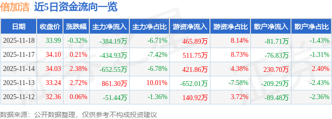 证券之星消息,截至2025年11月18日收盘,倍加洁(603059)报收于33.99元,下跌0.32%,换手率1.67%,成交量1.68万手,成交额5724.75万元。
