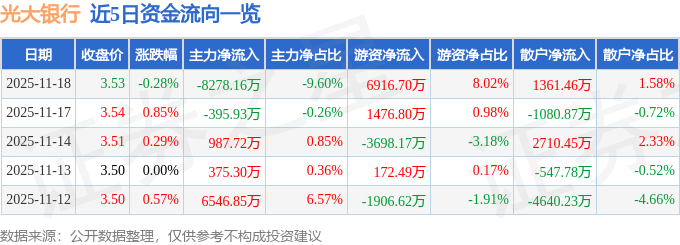 证券之星消息,截至2025年11月18日收盘,光大银行(601818)报收于3.53元,下跌0.28%,换手率0.53%,成交量244.44万手,成交额8.62亿元。