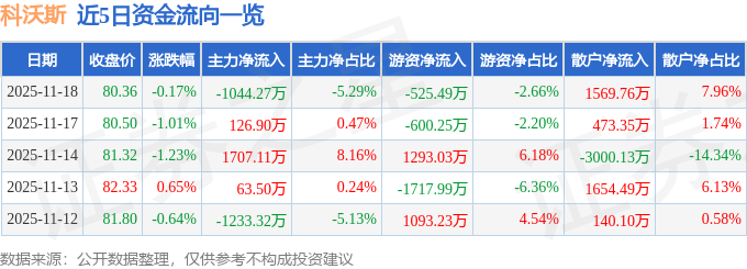 证券之星消息,截至2025年11月18日收盘,科沃斯(603486)报收于80.36元,下跌0.17%,换手率0.43%,成交量2.45万手,成交额1.97亿元。