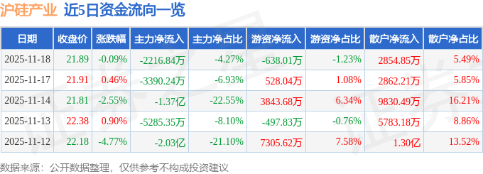11月18日的资金流向数据方面,主力资金净流出2216.84万元,占总成交额4.27%,游资资金净流出638.01万元,占总成交额1.23%,散户资金净流入2854.85万元,占总成交额5.49%。