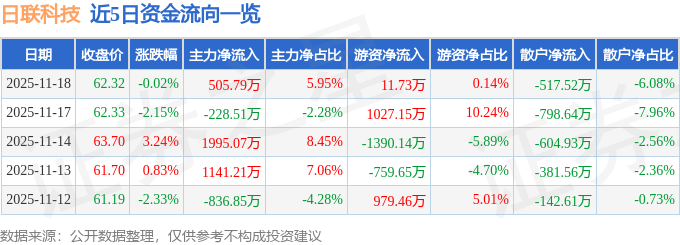 11月18日的资金流向数据方面,主力资金净流入505.79万元,占总成交额5.95%,游资资金净流入11.73万元,占总成交额0.14%,散户资金净流出517.52万元,占总成交额6.08%。