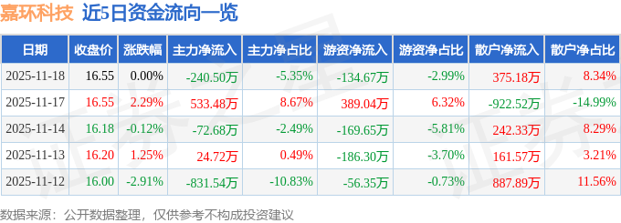 证券之星消息,截至2025年11月18日收盘,嘉环科技(603206)报收于16.55元,上涨0.0%,换手率0.89%,成交量2.71万手,成交额4496.97万元。