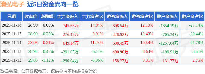 证券之星消息,截至2025年11月18日收盘,澳弘电子(605058)报收于28.9元,上涨0.0%,换手率1.21%,成交量1.72万手,成交额4990.3万元。