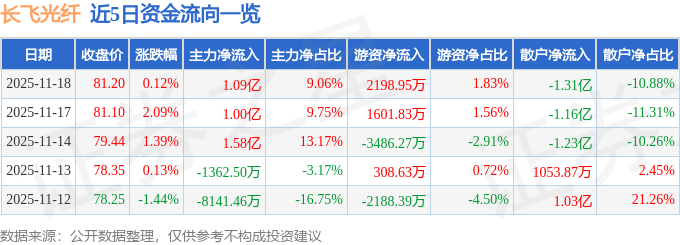 证券之星消息,截至2025年11月18日收盘,长飞光纤(601869)报收于81.2元,上涨0.12%,换手率3.65%,成交量14.84万手,成交额12.03亿元。