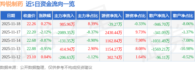 证券之星消息,截至2025年11月18日收盘,羚锐制药(600285)报收于22.26元,上涨0.27%,换手率0.94%,成交量5.29万手,成交额1.18亿元。