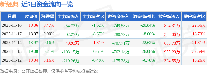 证券之星消息,截至2025年11月18日收盘,新经典(603096)报收于19.06元,上涨0.47%,换手率1.23%,成交量1.9万手,成交额3596.94万元。