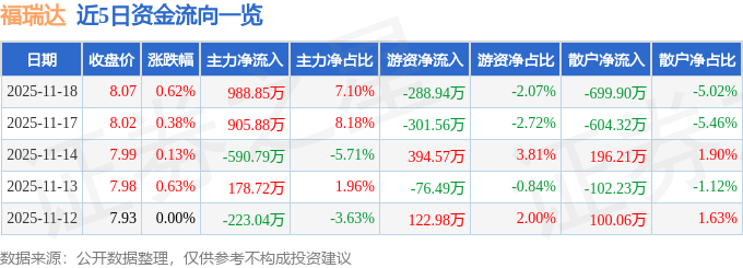 11月18日的资金流向数据方面,主力资金净流入988.85万元,占总成交额7.1%,游资资金净流出288.94万元,占总成交额2.07%,散户资金净流出699.9万元,占总成交额5.02%。