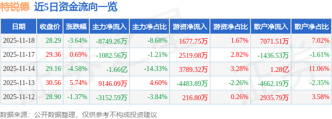 证券之星消息,截至2025年11月18日收盘,特锐德(300001)报收于28.29元,下跌3.64%,换手率3.45%,成交量35.57万手,成交额10.07亿元。