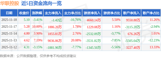 证券之星消息,截至2025年11月18日收盘,华联控股(000036)报收于5.1元,下跌3.41%,换手率11.51%,成交量161.21万手,成交额8.48亿元。
