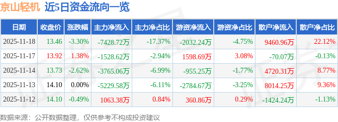 证券之星消息,截至2025年11月18日收盘,京山轻机(000821)报收于13.46元,下跌3.3%,换手率5.2%,成交量31.46万手,成交额4.28亿元。