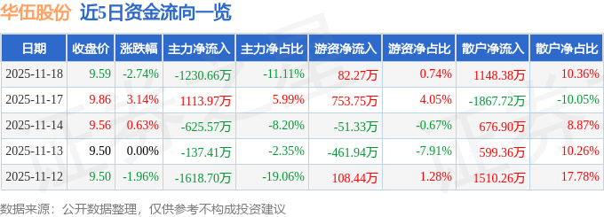 证券之星消息,截至2025年11月18日收盘,华伍股份(300095)报收于9.59元,下跌2.74%,换手率3.39%,成交量11.49万手,成交额1.11亿元。