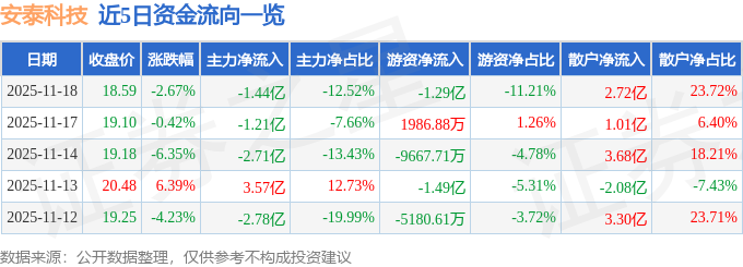 证券之星消息,截至2025年11月18日收盘,安泰科技(000969)报收于18.59元,下跌2.67%,换手率5.94%,成交量61.43万手,成交额11.48亿元。